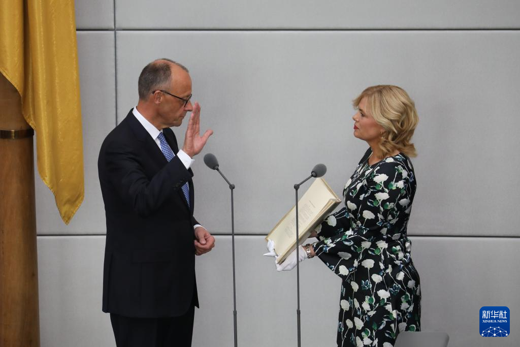 5月6日,在德國首都柏林的國會(huì)大廈,默茨(左)宣誓就職。