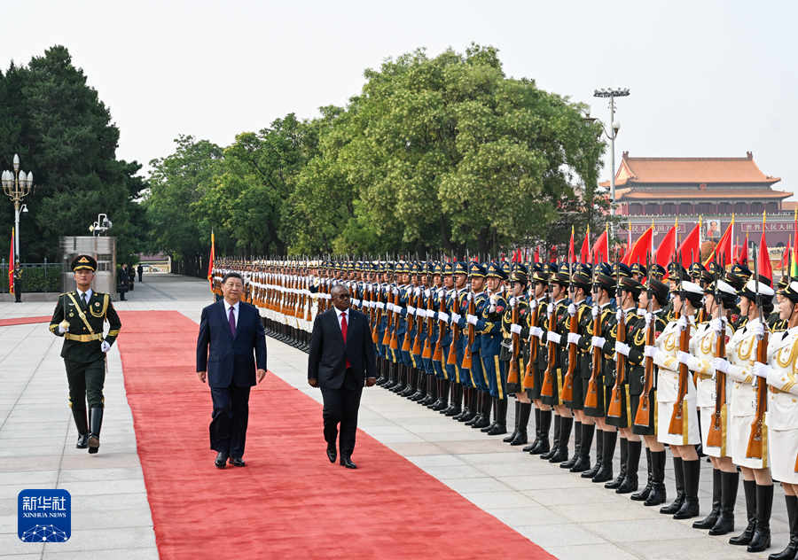 ??恩巴洛抵達時,禮兵列隊致敬。兩國元首登上檢閱臺,軍樂團奏中國和幾內(nèi)亞比紹兩國國歌,天安門廣場鳴放21響禮炮。恩巴洛在習近平陪同下檢閱中國人民解放軍儀仗隊,并觀看分列式。