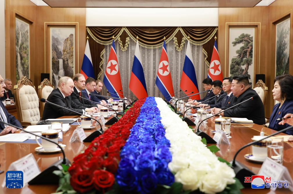 6月19日,在朝鮮平壤,朝鮮勞動黨總書記、國務(wù)委員長金正恩與俄羅斯總統(tǒng)普京舉行會談。